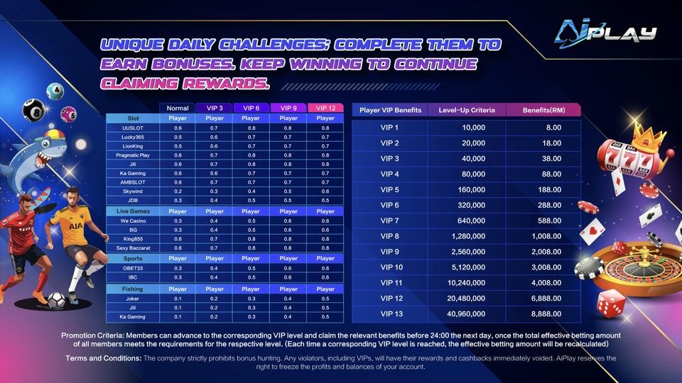 The AiPLAY VIP Program is designed to make your gaming experience more exciting and rewarding. With daily challenges, exclusive perks, and a clear path to leveling up, every bet and game is packed with fun, rewards, and VIP excitement!